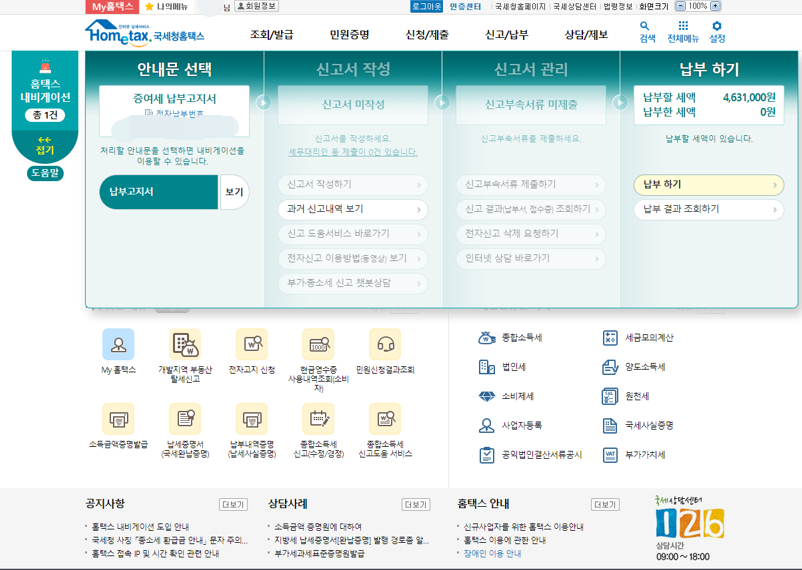 증여세를 납부했으나 과소신고라고 지역관할 세무서에서 판단하여 증여세 납부고지서를 보내왔습니다. 처음에는 과세예고통지서를 보내고 나서 지금처럼 증여네 납부고지서를 보내왔습니다. 증여세 납부고지서는 홈택스에서 로그인하자마자 홈택스 내비게이션이 바로 알려줘서 확인을 할 수 있었습니다.