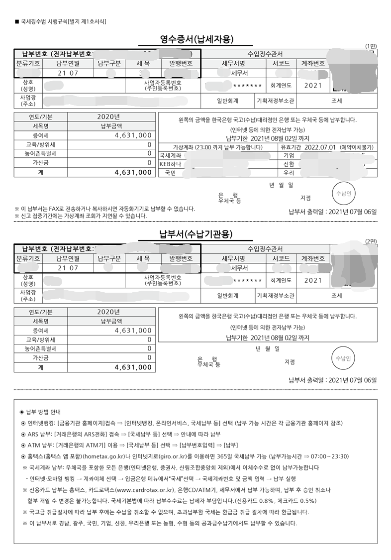 납부에 관한 영수증서도 다음과 같이 출력할 수 있으니 확인해보시기 바랍니다.