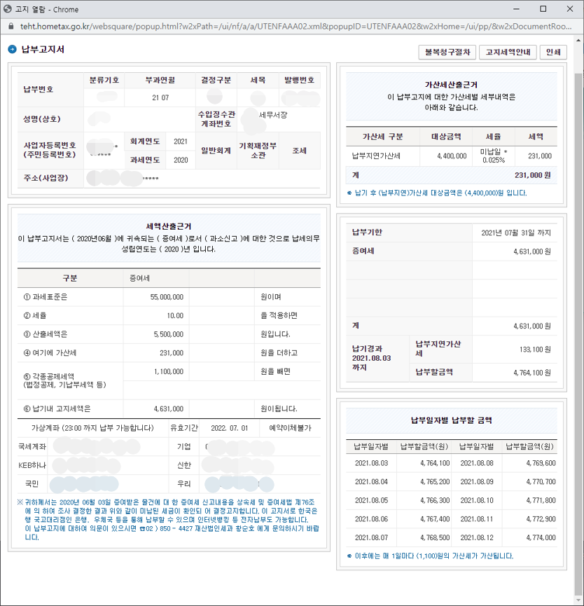 납부고지서 보기를 통해서 과세표준, 세율, 산출세액, 각종공제세액(법정공제, 기납부세액)등 계산된 고지세액을 확인할 수 있습니다. 증여세 납부는 납기일이 있기 때문에 납부지연가산세를 내지 않도록 기한내에 내는 것이 좋을 것 같습니다.