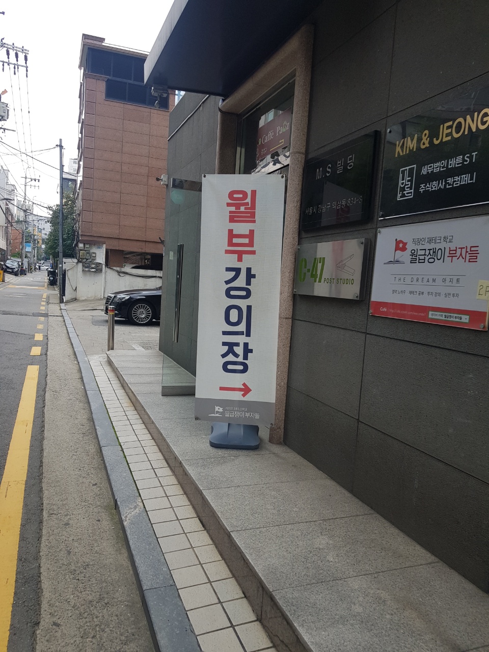 그래서 10월 일요일 강남역 근처 월급쟁이부자들학원이라는 곳을 처음으로 찾아가게 되었습니다. 늘 카페로만 접속하던 곳의 간판을 매주하니 내가 '실행의 첫걸음'을 하고 있구나라고 느꼈습니다.