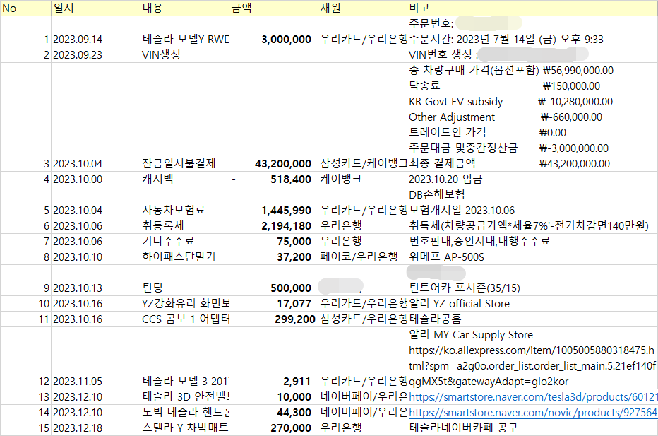 테슬라 모델Y RWD 2023년도에 5699시절가격으로 샀을때 들었던 소요비용입니다.