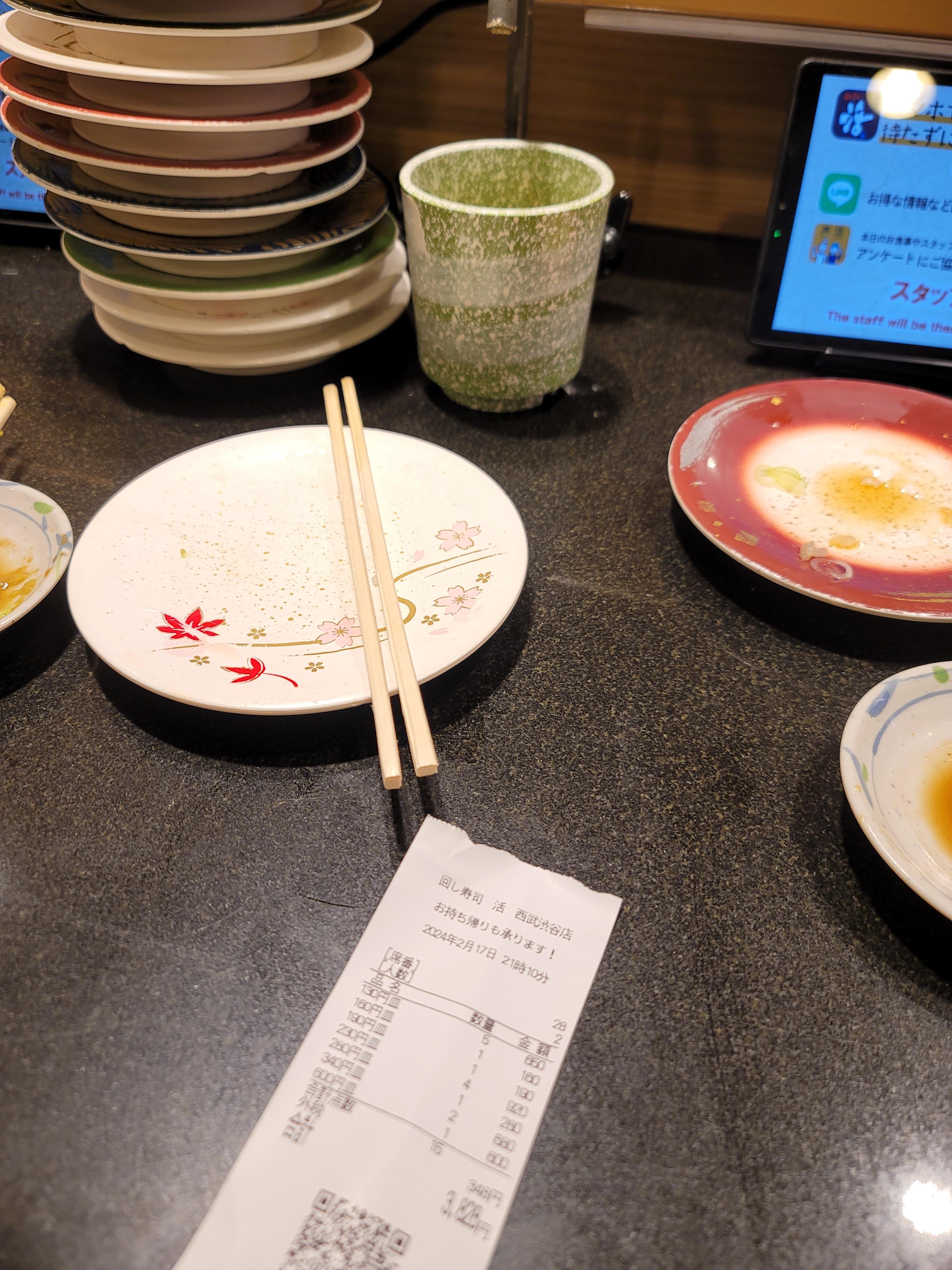 이렇게 저렇게 총 15접시를 먹었는데 3828엔이 나왔고 환율 889.75로 계산하면 33968원이라는 가격이 나오는 충격적인 가격 심지어 배부르게 먹었는데 갯수대비 이가격이면 아주 혜자아닌가 싶습니다. 초밥 품질이 떨어지는것도 아니고 사람들이 계속 방문하는 인증맛집임에도 이정도면 정말 좋은 가성비 맛집인것 같습니다.