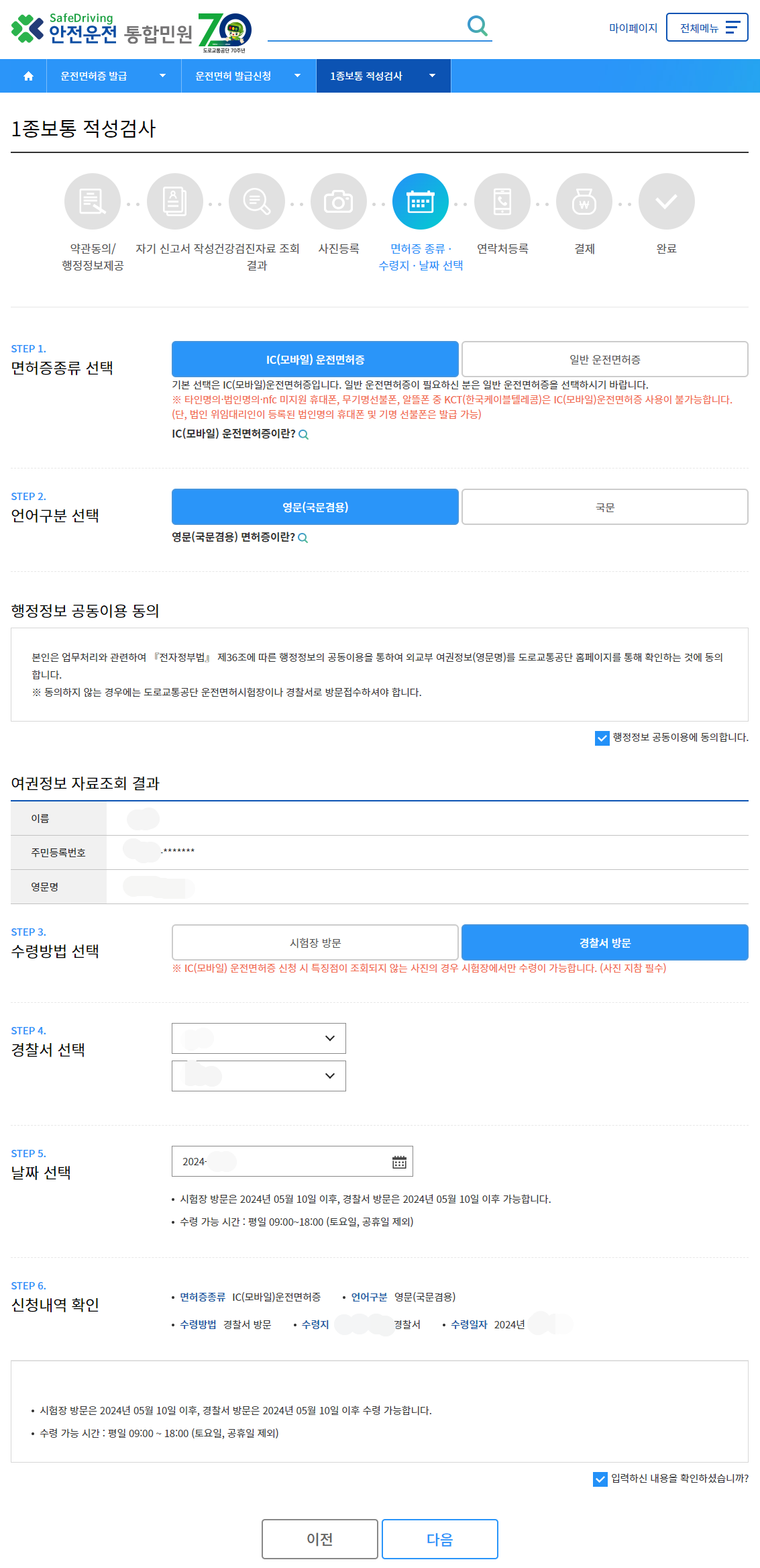 운전면허증 종류를 선택하고 교부받을 장소와 날짜를 선택해줍니다.