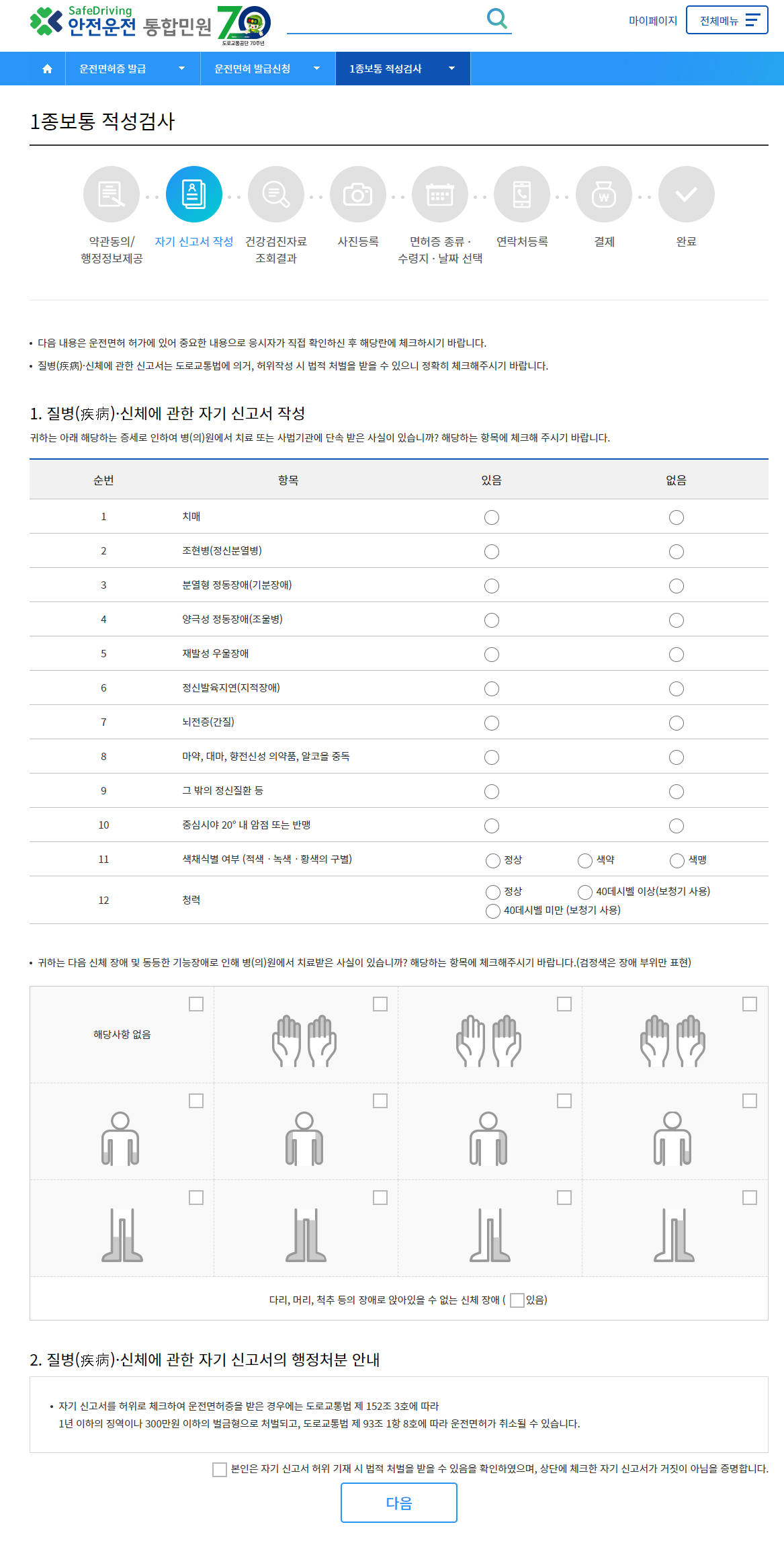 질병신체에 관한 자기 신고서를 작성해줍니다. 평소에 보유하고 있는 병원이나 치료이력을 체크해줍니다.
