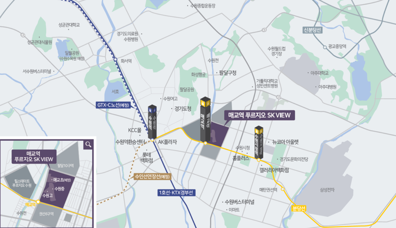 우선 매교역 도보권에 한정거장 다음에 수원역 1호선, KTX, GTX-C(향후)가 이용가능합니다.